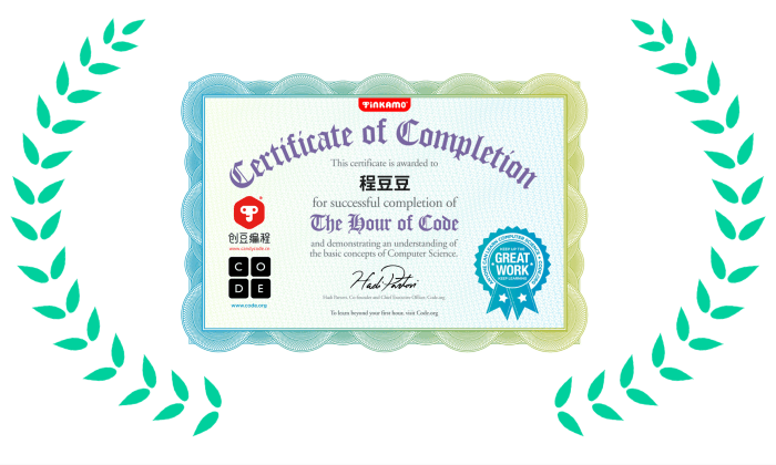 編程一小時(The Hour of Code)是一個全球性的公益活動,并獲得了比爾蓋茨、扎克伯格等科技精英的大力支持,連美國前總統(tǒng)奧巴馬都學(xué)習(xí)過。孩子們在創(chuàng)豆編程完成階段學(xué)習(xí)后將獲得國際認(rèn)證的《編程一小時證書》。
